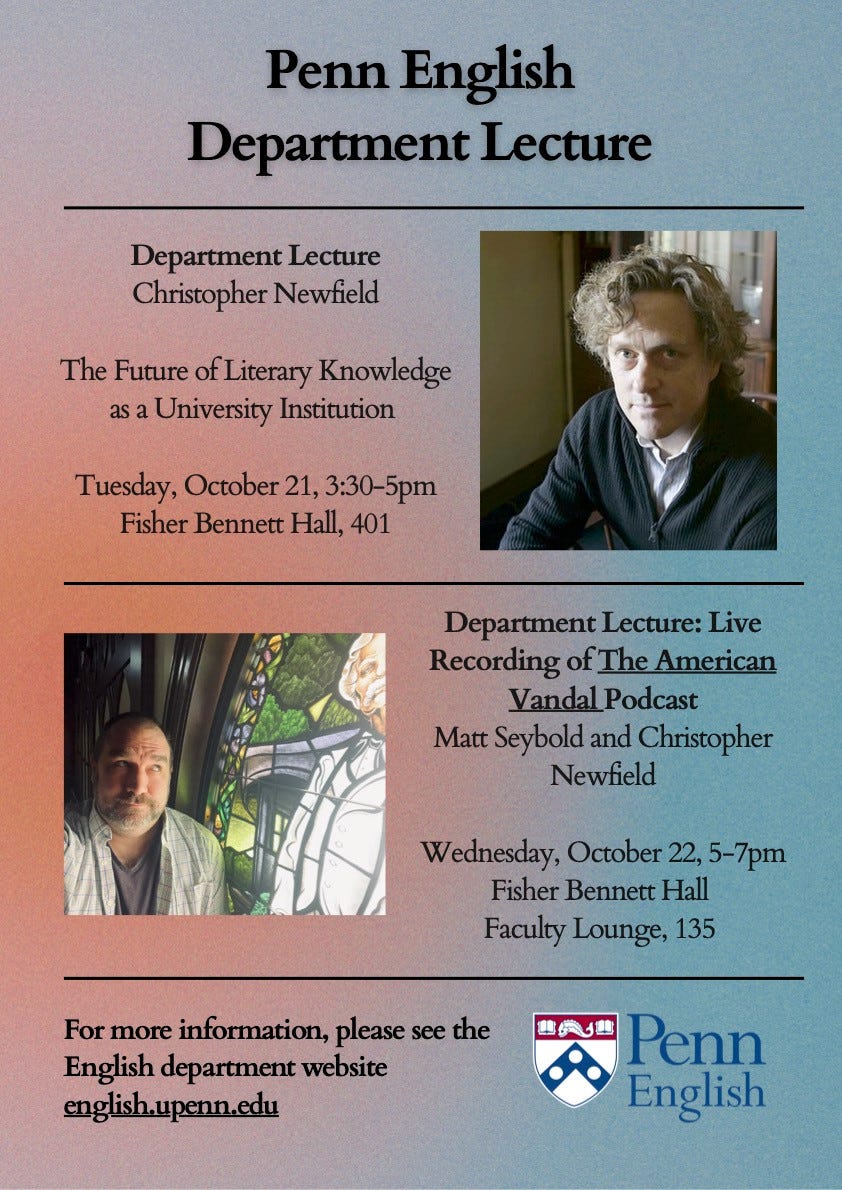 A spirited discussion of the state of higher education, the history of criticism, and the future of literary knowledge production, recorded with a live audience at University of Pennsylvania’s English Faculty Lounge as part of the annual Penn English Department Lecture, delivered this year by Christopher Newfield.