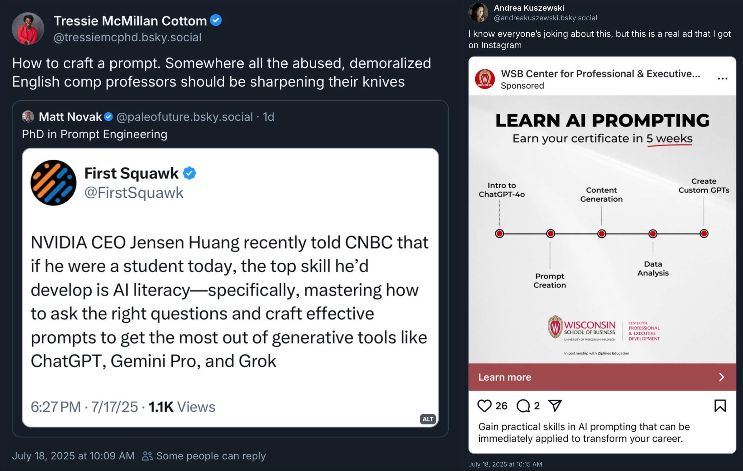 Over the weekend, “prompt engineering” was briefly trending on Bluesky, as skeeters circulated two pieces of viral content, an alleged call for increasing scholastic “AI literacy” from NVIDIA CEO, Jensen Huang, and an Instagram ad promising certification in “AI prompting” through the Wisconsin School of Business’s Center for Professional and Executive Development.
